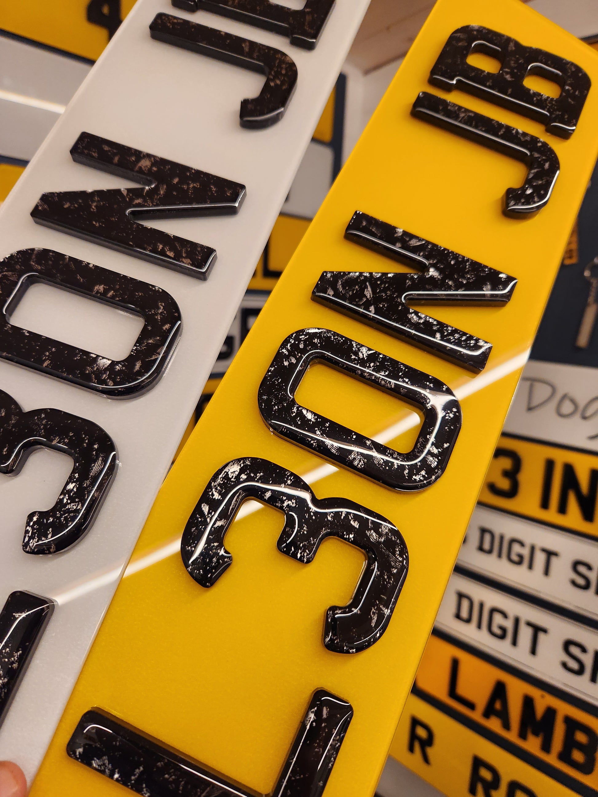 A set of high quality Fordged carbob gel resin 3D number plates, these are show use only and not for road use, and therefore will not include any legal markings.